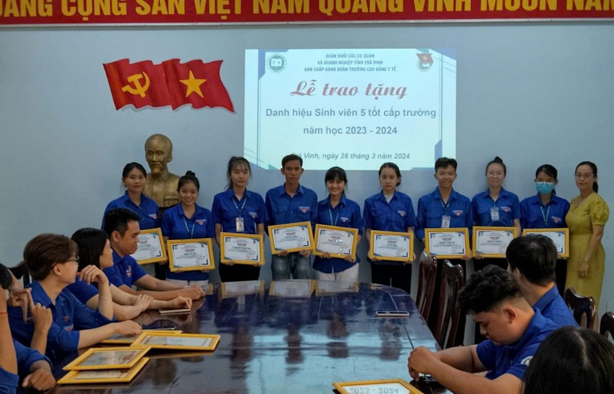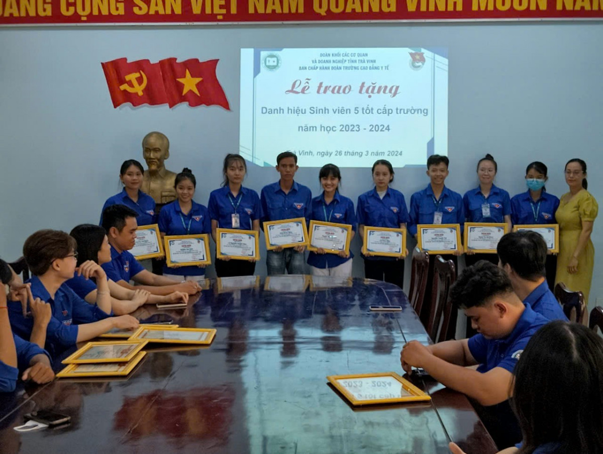 Ngày 26/3/2024, Đoàn trường Cao đẳng Y tế Trà Vinh tổ chức lễ tuyên dương danh hiệu “Sinh viên 5 tốt” cấp trường năm học 2023 – 2024 nhân kỷ niệm 93 năm Ngày thành lập Đoàn TNCS Hồ Chí Minh (26/31931 – 26/3/2024) cho 15 sinh viên đạt danh hiệu “Sinh viên 5 tốt” cấp trường năm học 2023 – 2024. Tham dự chương trình có đồng chí Trần Thị Bé Oanh, Phó Bí thư Chi bộ Trường Cao đẳng Y tế Trà Vinh; đồng chí Nguyễn Trường Sơn, Phó Bí thư Đoàn trường và các đồng chí trong Ban Thường vụ, Ban Chấp hành Đoàn trường.