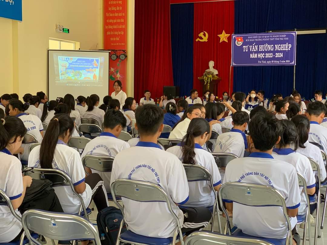 Nhằm định hướng nghề nghiệp cho các em học sinh. Sáng ngày 09/3/2024, Ban Chấp hành Đoàn trường Phổ thông DTNT – THPT tỉnh phối hợp với Chi hội sinh viên tỉnh Trà Vinh tổ chức chương trình tư vấn, hướng nghiệp cho đoàn viên thanh niên là học sinh của trường. Hoạt động thu hút trên 200 đoàn viên, thanh niên tham gia.