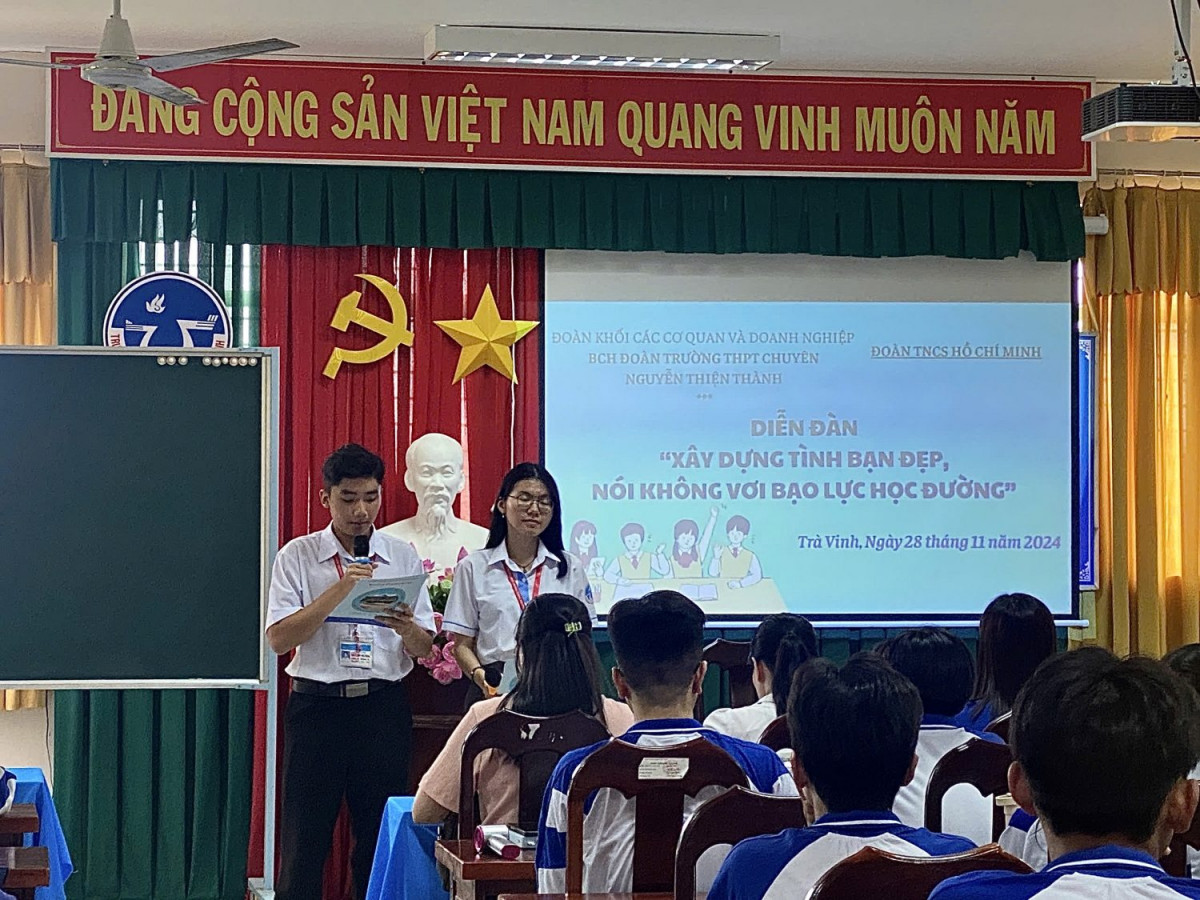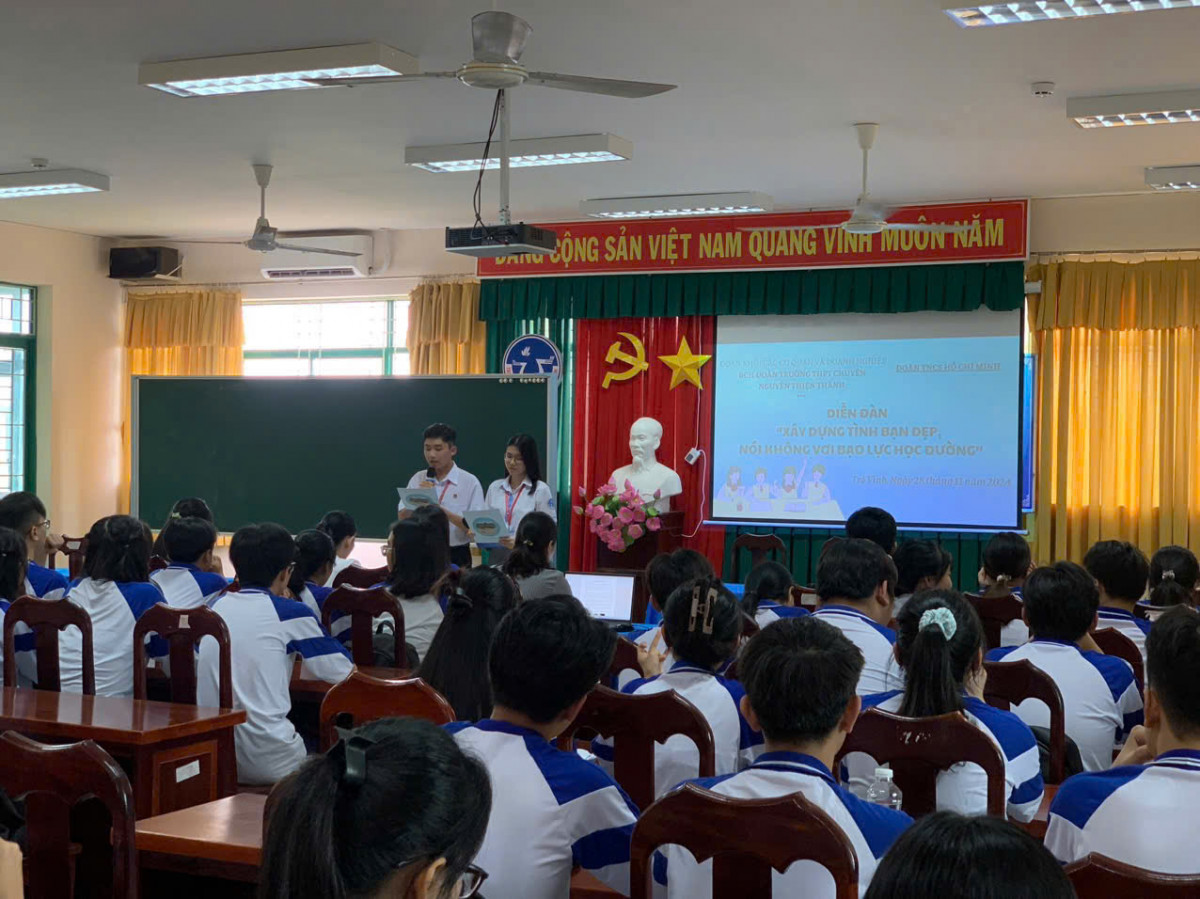 Ngày 28/11/2024, Ban Chấp hành Đoàn trường THPT Chuyên Nguyễn Thiện Thành tổ chức diễn đàn “Xây dựng tình bạn đẹp, nói không với bạo lực học đường” năm học 2024 – 2025 với sự tham dự của quý thầy cô trong Ban tư vấn học đường, BCH Đoàn trường và 135 đoàn viên, thanh niên đại diện cho các chi đoàn lớp.