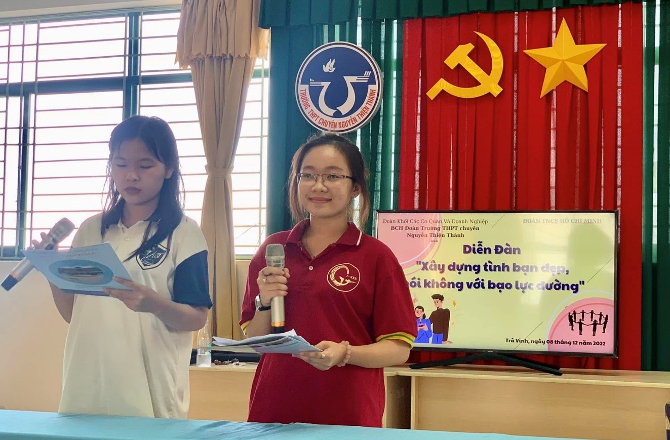 Nhằm tuyên truyền, phổ biến các kiến thức về phòng chống bạo lực học đường để hướng tới xây dựng tình bạn đẹp trong cán bộ, giáo viên, đoàn viên, thanh niên. Ngày   08/12/2022, Ban Chấp hành Đoàn trường THPT Chuyên Nguyễn Thiện Thành tổ chức Diễn đàn “Xây dựng tình bạn đẹp – Nói không với bạo lực học đường” năm học 2022 – 2023 với sự tham gia của hơn 135 đoàn viên, thanh niên của trường.
