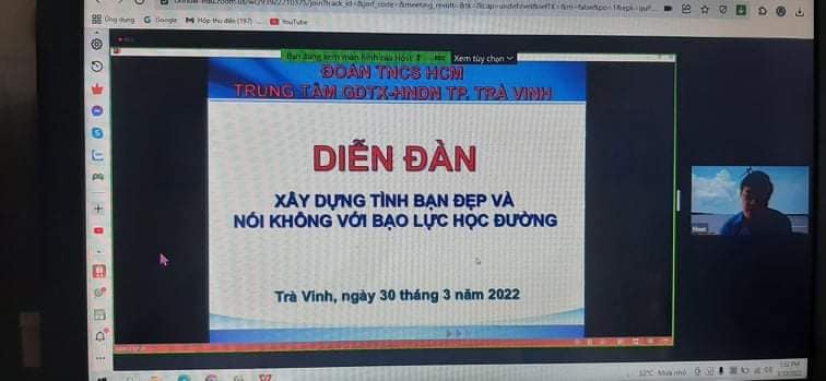 Ngày 30/3/2022, Đoàn trường TTGDTX & HNDN TP Trà Vinh tổ chức diễn đàn “Xây dựng tình bạn đẹp – Nói không với bạo lực học đường”. Đây là hoạt động nhằm giáo dục cho các em học sinh hiểu được vai trò và ý nghĩa của tình bạn trong môi trường học tập cũng như trong cuộc sống. Diễn đàn thu hút trên 60 em học sinh tham gia.