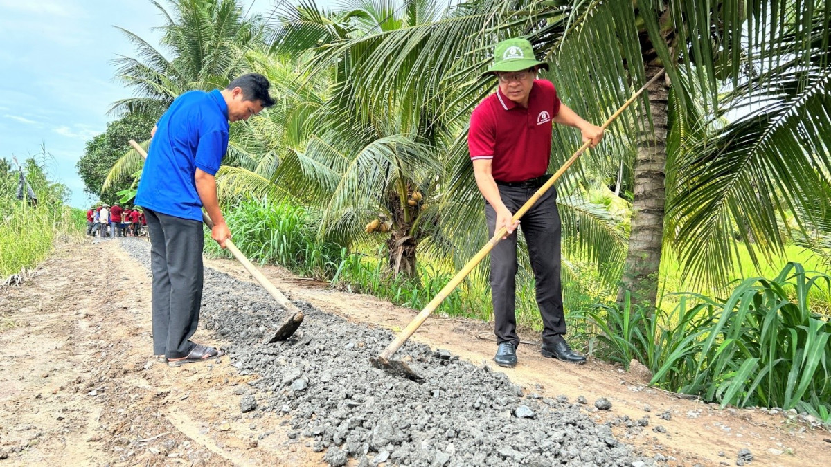 Lãnh đạo cùng các chiến sỹ tham gia đổ đá sửa chữa, nâng cấp đường giao thông nông thôn tại Ấp Phú Thọ II