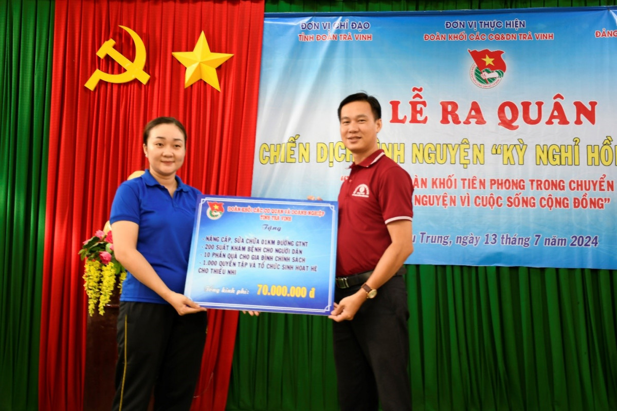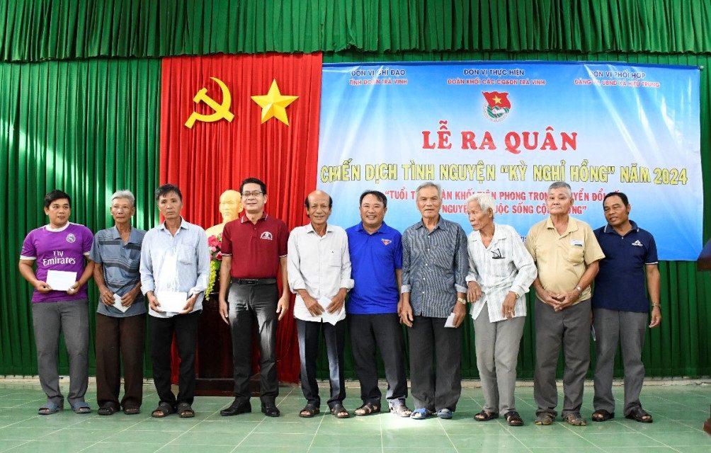 Tại buổi lễ ra quân, Ban Thường vụ Đoàn khối đã trao tặng 10 phần quà cho gia đình chính sách tại xã Hiếu Trung (mỗi phần trị giá 500.000 đồng); trao tặng nguồn lực hỗ trợ cho 01 dự án khởi nghiệp đổi mới sáng tạo 5.000.000 đồng; trao tặng 01 bản đồ Việt Nam hưởng ứng cuộc vận động “Tự hào một dãy non sông” do Trung ương Đoàn phát động. Dịp này, Đoàn cũng đã đến thăm và trao tặng 01 phần quà cho Mẹ Việt Nam anh hùng (mẹ Thạch Thị Xua) ngụ tại ấp Tân Trung Giồng B, xã Hiếu Trung trị giá 1.000.000 đồng.