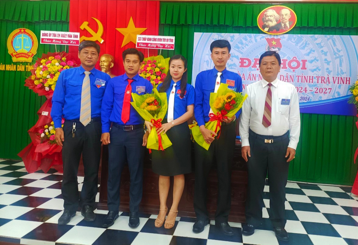 Lãnh đạo tặng hoa chụp ảnh lưu niệm với Bí thư, Phó Bí thư Chi đoàn Tòa án nhân dân tỉnh Trà Vinh nhiệm kỳ 2024 – 2027