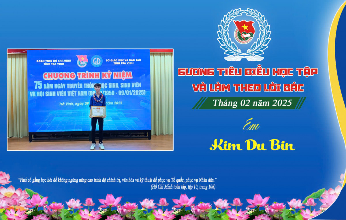 Không chỉ là một đoàn viên tiêu biểu, mà Du Bin còn là tấm gương sáng trong việc học tập và rèn luyện theo tấm gương đạo đức của Bác. Sự kiên trì, cố gắng và nhiệt huyết của em đã và đang truyền động lực cho rất nhiều bạn đồng trang lứa noi theo.