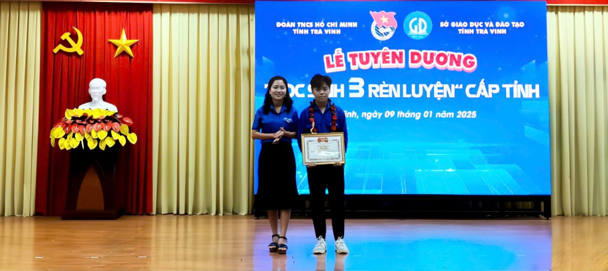 Đồng chí Dương Thị Yến Nhi – UVBTV, Trưởng Ban TTN – TH tặng bằng khen tuyên dương Học sinh “3 rèn luyện” cấp tỉnh cho em Trần Xuân Thái