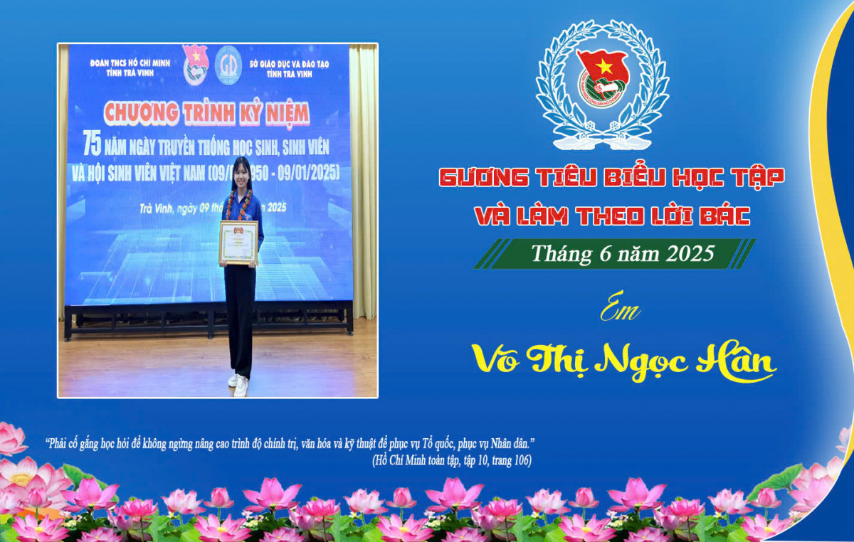 Đặc biệt, trong Hội thi “Tìm hiểu về cuộc đời, thân thế và sự nghiệp cách mạng của Chủ tịch Hồ Chí Minh” năm 2024, em cùng các thành viên trong nhóm xuất sắc giành giải Nhất. Với những nỗ lực không ngừng nghỉ, em được tặng giấy khen vì thành tích xuất sắc trong công tác Đoàn và phong trào thanh niên năm học 2023–2024. Song song đó, Nhân dịp đầu năm học 2024–2025, em còn vinh dự được Ban Chấp hành Tỉnh đoàn Trà Vinh tuyên dương là “Sinh viên 5 tốt” cấp tỉnh. Đây chính là kết quả ghi nhận những nỗ lực và phấn đấu không ngừng nghỉ của em trong quá trình học tập, rèn luyện và cống hiến. Với những thành tích đó, Ngọc Hân xứng đáng là một tấm gương học tập và làm theo lời Bác để các bạn đoàn viên, thanh niên trong Trường học tập và làm theo./.