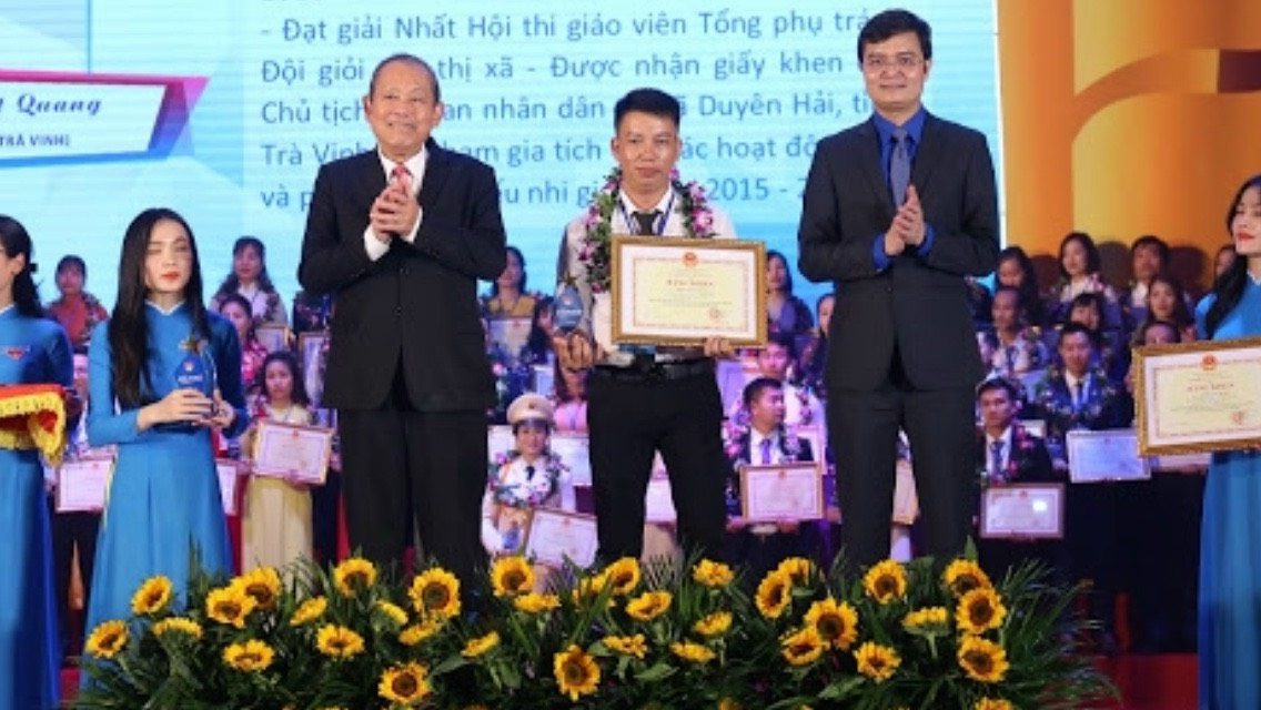 Thầy Phạm Nhựt Quang – Giáo viên làm Tổng phụ trách Đội trường THCS Nguyễn Đáng, Thị xã Duyên Hải vinh dự khi được nhận giải thưởng cao quý “Cánh én hồng” do Hội đồng Đội Trung ương trao tặng.