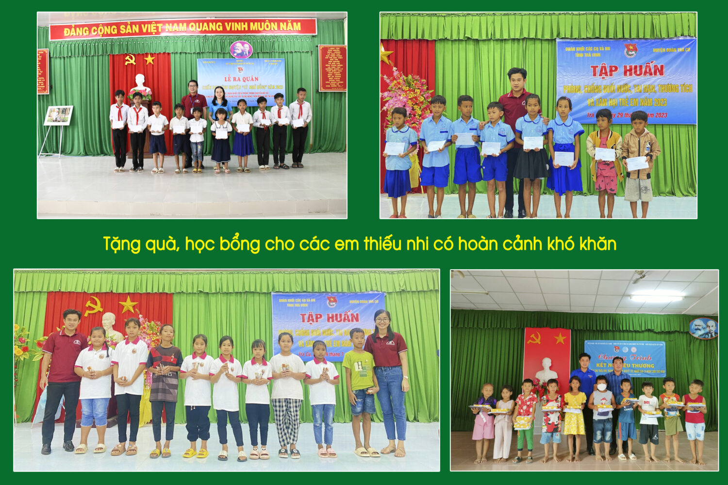 Ngoài ra, các cơ sở Đoàn trực thuộc Đoàn khối cũng đã triển khai, thực hiện nhiều hoạt động ý nghĩa, thiết thực mang lại hiệu ứng cao và được sự ủng hộ nhiệt tình của đoàn viên, thanh niên và người dân tại các địa phương trên địa bàn tỉnh, tiêu biểu như: khám, tư vấn, cấp thuốc miễn phí cho trên 1.039 người dân và trao 808 phần quà cho người có hoàn cảnh khó khăn trên địa bàn tỉnh (trị giá 293.000.000 đồng); đồng thời trao tặng 908 phần quà, 152 suất học bổng, 2.800 quyển tập và 03 bộ sách giáo khoa cho trẻ em, học sinh có hoàn cảnh khó khăn trên địa bàn tỉnh với 264.900.000 đồng. Đặc biệt, nhân dịp kỷ niệm 76 năm Ngày Thương binh – Liệt Sĩ (27/7/1947 – 27/7/2023) các cơ sở Đoàn đã tổ chức, thăm hỏi, tặng 56 phần quà, tổ chức 02 bữa cơm yêu thương (tổng kinh phí 55.100.000 đồng). Bên cạnh đó, các cơ sở Đoàn trực thuộc còn phối hợp với người dân tại địa phương ra quân thực hiện vớt lục bình khai thông dòng chảy, tạo thuận lợi cho giao thông đường thủy, sản xuất nông nghiệp, nuôi trồng thuỷ sản tại các tuyến kênh trên địa bàn tỉnh trong đợt ra quân hưởng ứng ngày cao điểm chung tay xây dựng nông thôn mới và ngày chủ nhật xanh đợt 3, năm 2023.