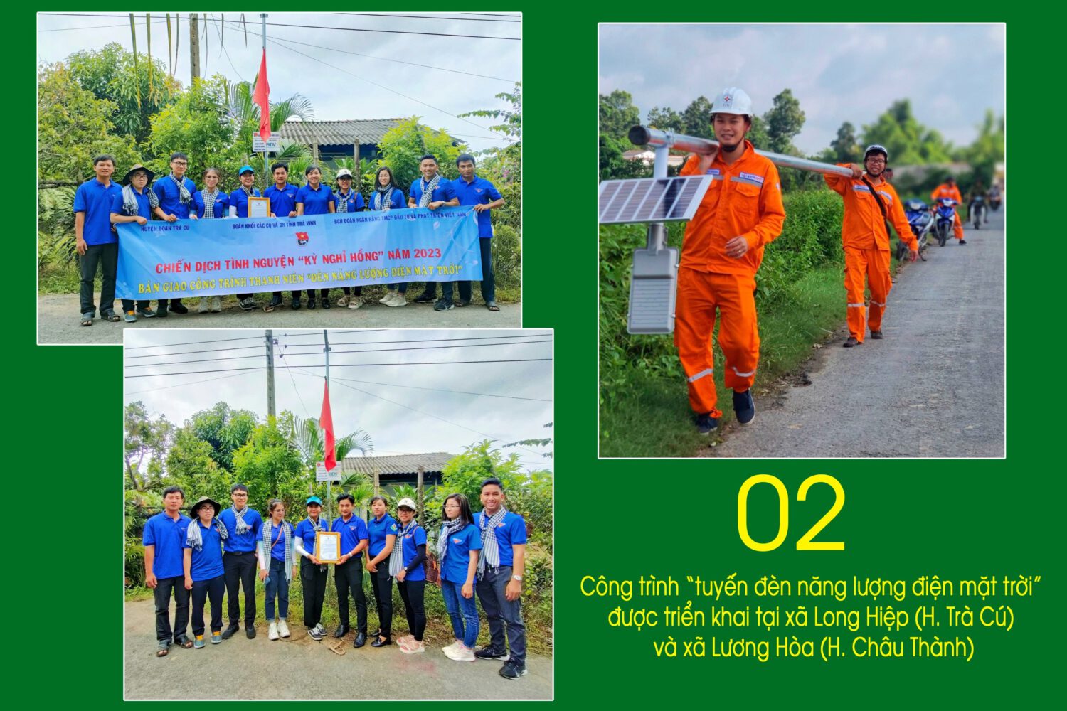 Thời gian diễn ra chiến dịch bắt đầu từ ngày 15/7 đến ngày 20/8/2023, với 600 chiến sĩ (trong đó 30 chiến sỹ tham gia đội hình thanh niên công nhân; 100 chiến sỹ là cán bộ, đoàn viên thanh niên trong khối; 40 chiến sỹ tham gia hoạt động dưới dạng các đội hình chuyên và thanh niên đối ứng tại địa phương). Cao điểm là thực hiện ra quân trong 04 đợt liên tục vào các ngày thứ Bảy và Chủ nhật, tại 02 huyện Trà Cú và huyện Duyên Hải với nhiều công trình, phần việc, hoạt động thiết thực như: Thực hiện 02 công trình thanh niên “tuyến đèn năng lượng mặt trời” với chiều dài 02 km và công trình “thắp sáng đường quê” với chiều dài 0.6km (tổng kinh phí 100 triệu đồng); rãi đá, nâng cấp, sửa chữa tuyến đường giao thông nông thôn dài 3km, xây dựng mới 0.3km tuyến đường đal (tổng kinh phí 104 triệu đồng); bàn giao 03 căn “Ngôi nhà Tuổi trẻ” (tổng kinh phí 150 triệu đồng); trao 20 suất học bổng cho học sinh có hoàn cảnh khó khăn tại huyện Trà Cú (tổng kinh phí 10 triệu đồng); thăm, hỏi tặng 35 phần quà cho Mẹ Việt Nam Anh hùng; gia đình chính sách, người dân có hoàn cảnh khó khăn, cựu thanh niên xung phong,..(tổng kinh phí 20 triệu đồng); trao tặng 50 phần quà cho người dân, trẻ em có hoàn cảnh khó khăn tại xã Thạnh Hòa Sơn (tổng kinh phí 15 triệu đồng); hỗ trợ sửa chữa nâng cấp 01 khu vui chơi tại xã Long Vĩnh (trị giá 05 triệu đồng); trao tặng nguồn lực hỗ trợ cho 02 dự án khởi nghiệp đổi mới sáng tạo và dự án khởi nghiệp lập nghiệp cho thanh niên trong lĩnh vực bảo vệ môi trường ứng phó biến đổi khí hậu (tổng kinh phí 10 triệu đồng); trao tặng 60 thùng bánh green food cho Huyện Đoàn Trà Cú, Cầu Ngang và Duyên Hải tổng kinh phí 64.8 triệu đồng; hỗ trợ giải quyết đầu ra nông sản cho 1.376 kg dưa lưới.
