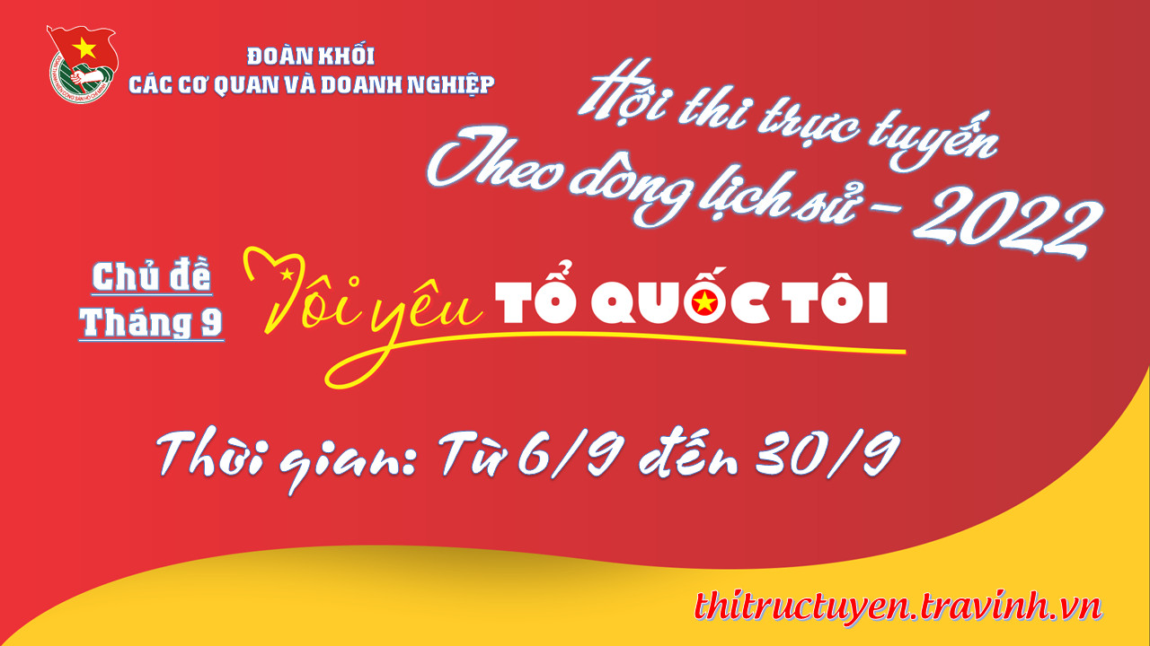 Cuộc thi “Theo dòng lịch sử” với chủ đề tháng 9 “Tôi yêu Tổ quốc tôi” được diễn ra từ ngày 06/9 đến ngày 30/9/2022. Cuộc thi đã thu hút trên 823 cán bộ, đoàn viên, thanh niên tham gia với 3.462 lượt dự thi.