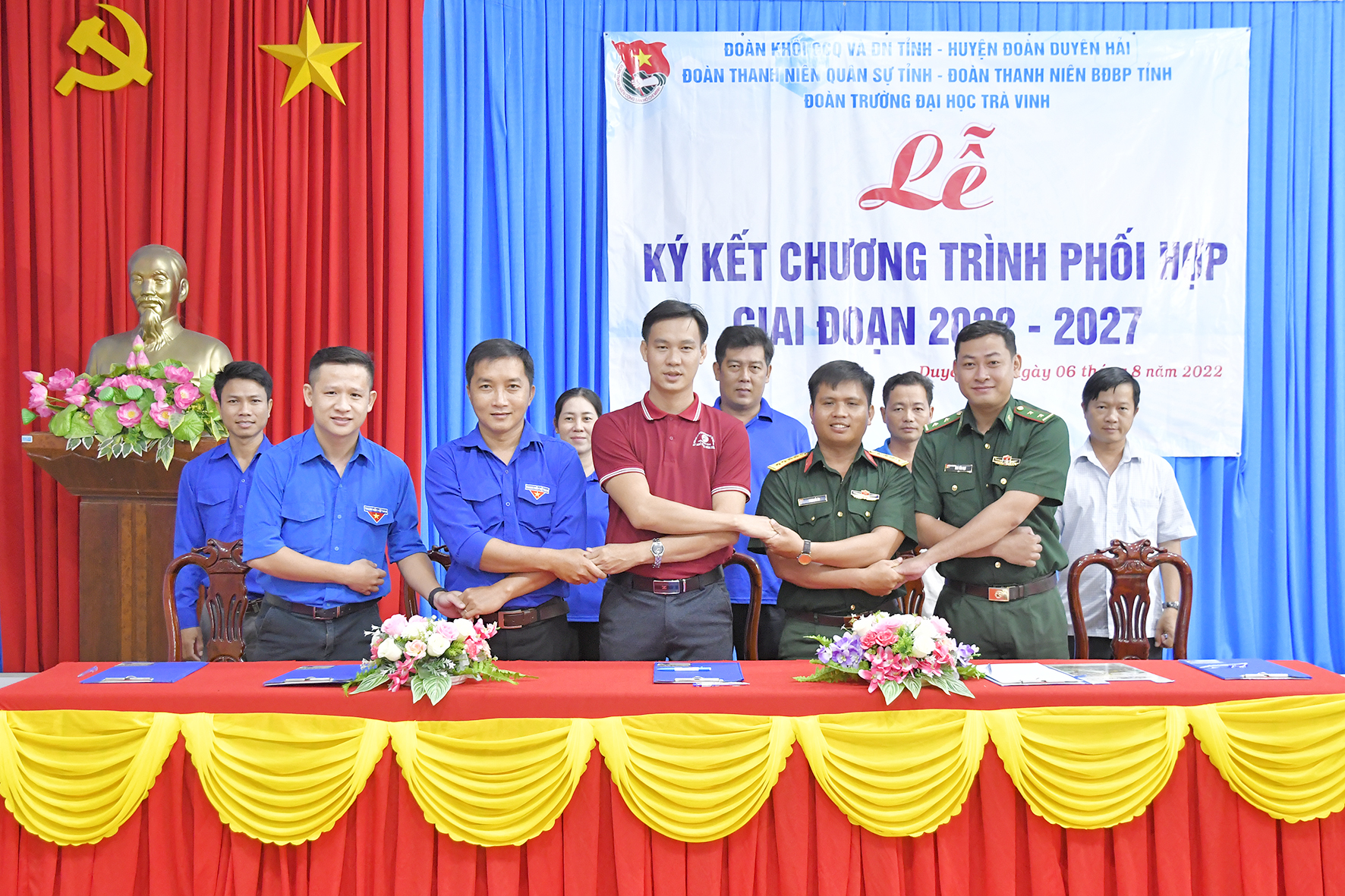 Nhằm thực hiện hiệu quả công tác phối hợp trong triển khai các hoạt động của đoàn trong thời gian tới. Ngày 06/8/2022, Đoàn khối các cơ quan và doanh nghiệp tỉnh, Đoàn TN Bộ Chỉ huy Quân sự tỉnh, Đoàn TN Bộ Chỉ huy Bộ đội Biên phòng tỉnh, Huyện đoàn Duyên Hải, Đoàn Trường Đại học Trà Vinh tổ chức Lễ ký kết chương trình phối hợp giai đoạn 2022 – 2027.