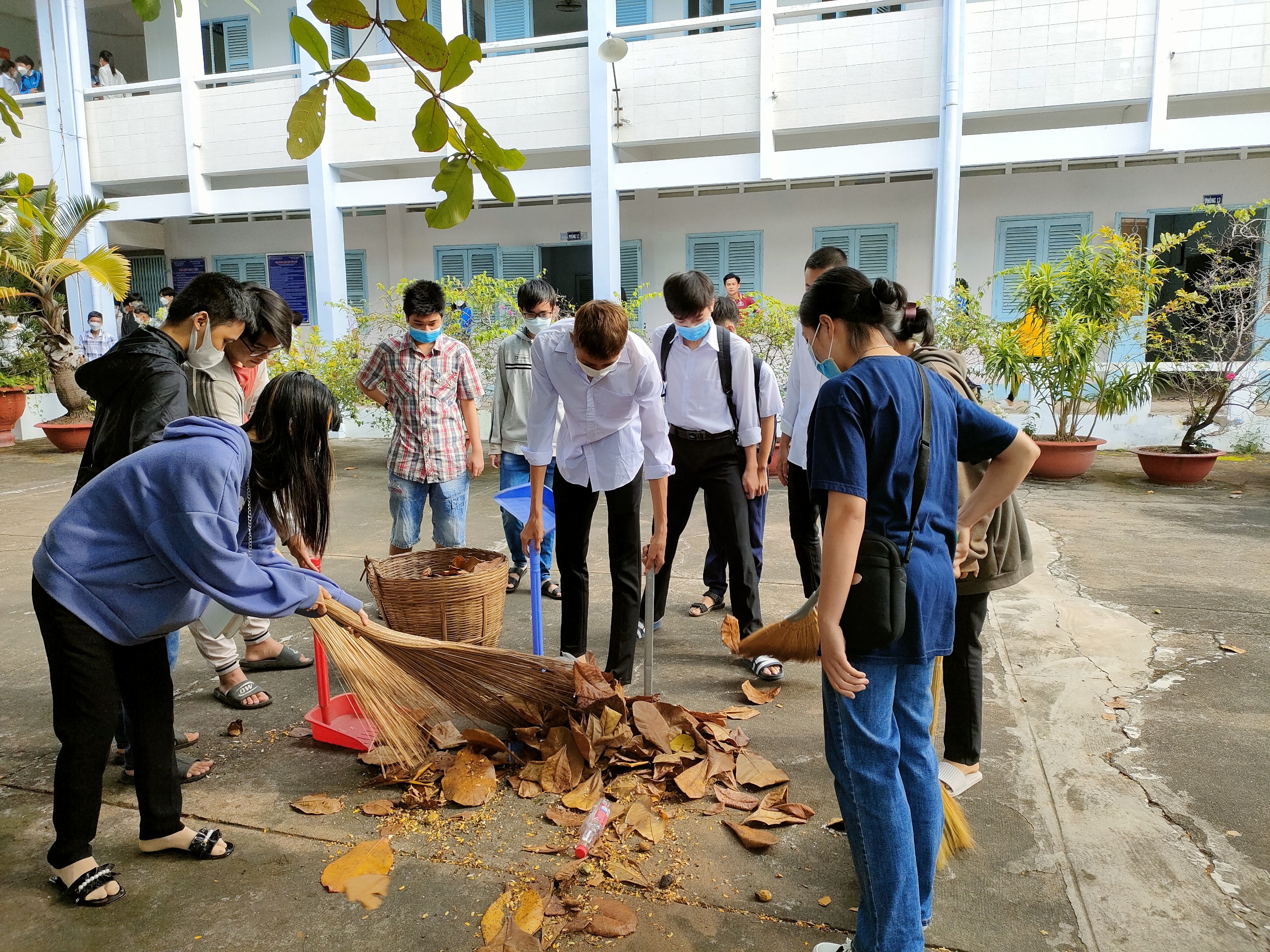 Các em học sinh vệ sinh xung quanh khuôn viên trung tâm
