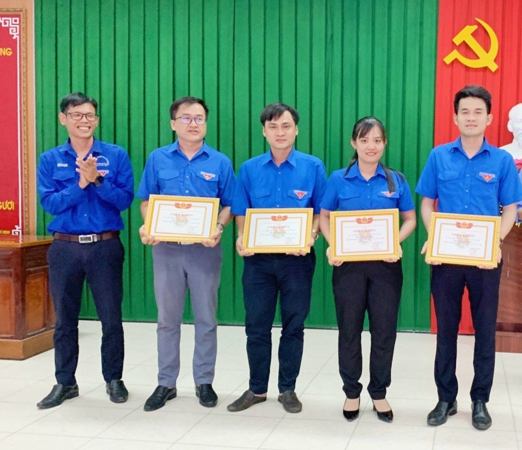 Đồng chí Nguyễn Minh Trí – Phó Bí thư Đoàn khối, Bí thư Đoàn cơ sở Công ty Điện lực Trà Vinh trao giải khuyến khích và chụp ảnh lưu niệm với thí sinh