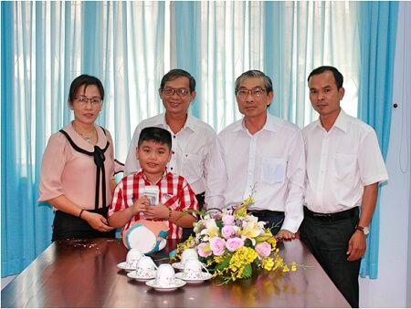 Bé Nguyễn Gia Phát chụp ảnh lưu niệm cùng lãnh đạo Ủy ban MTTQ Việt Nam tỉnh Trà Vinh