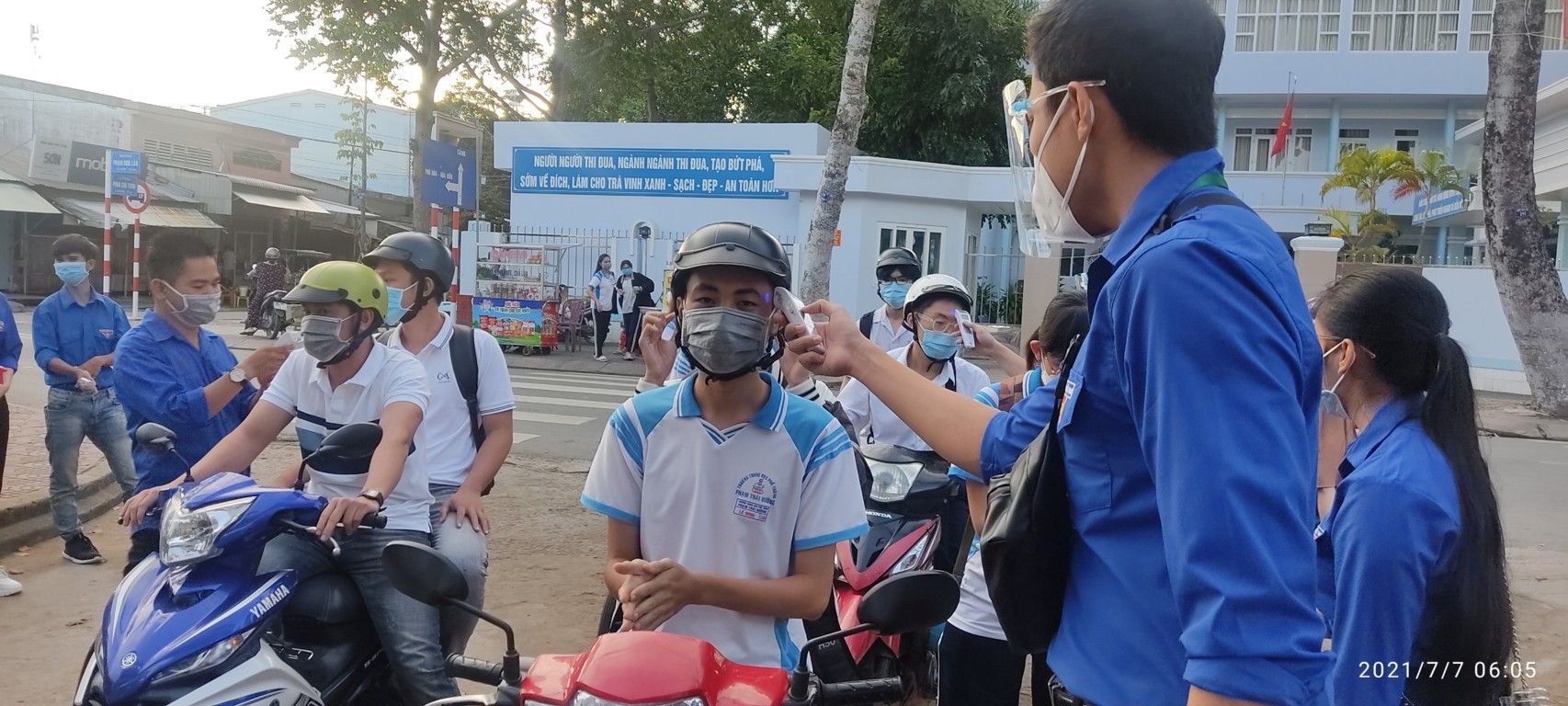 Đội thanh niên tình nguyện “Tiếp sức mùa thi” của Đoàn Trường Cao đẳng Y tế Trà Vinh đo thân nhiệt cho các thí sinh