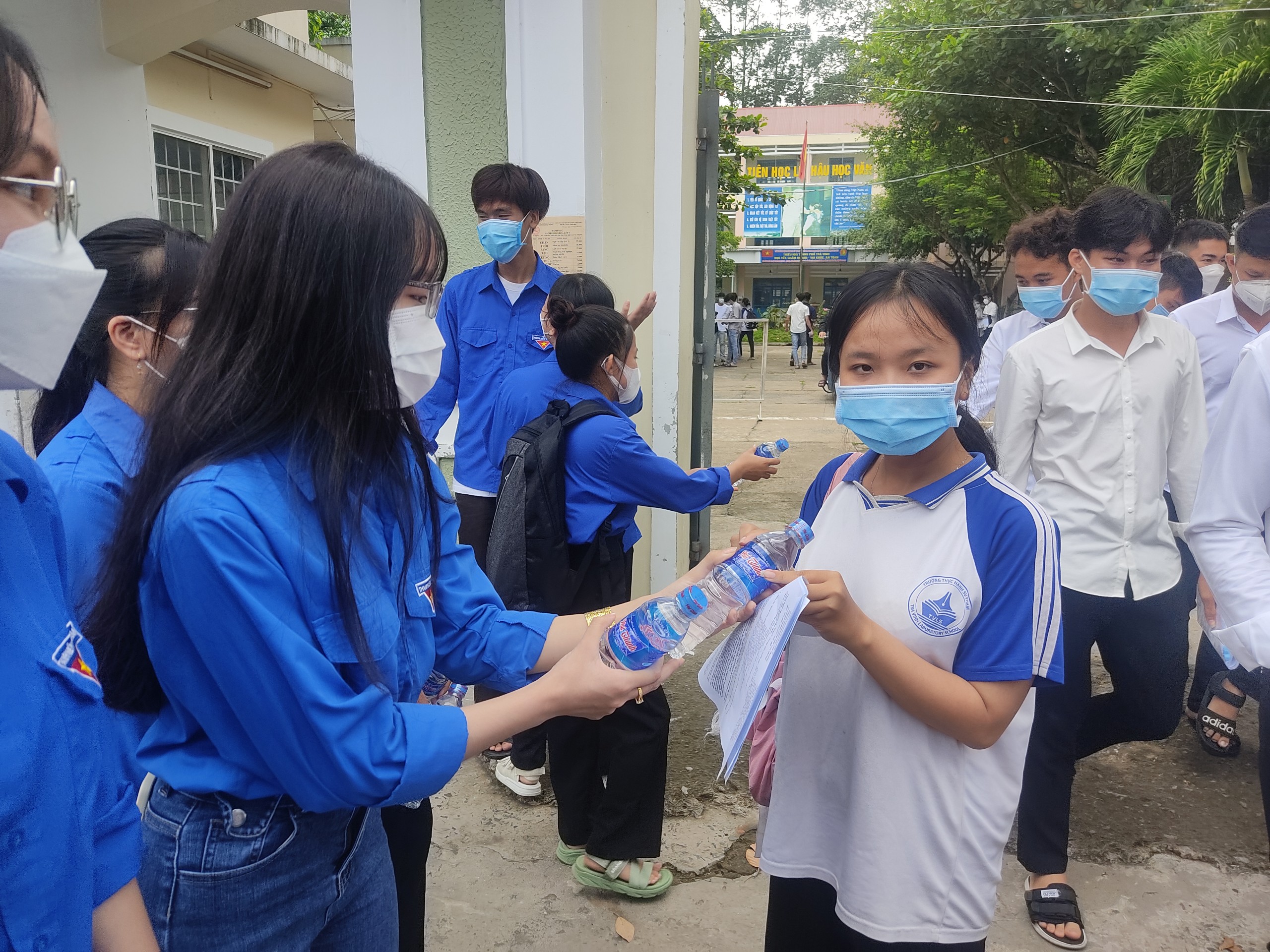 Đồng chí Nguyễn Trọng Nhân – Bí thư Đoàn khối các cơ quan và doanh nghiệp tỉnh và đồng chí Lâm Chí Trung – Phó Bí thư Đoàn khối các cơ quan và doanh nghiệp đến thăm, tặng quà cho đội hình chuyên tại điểm thi THPT Thành phố Trà Vinh