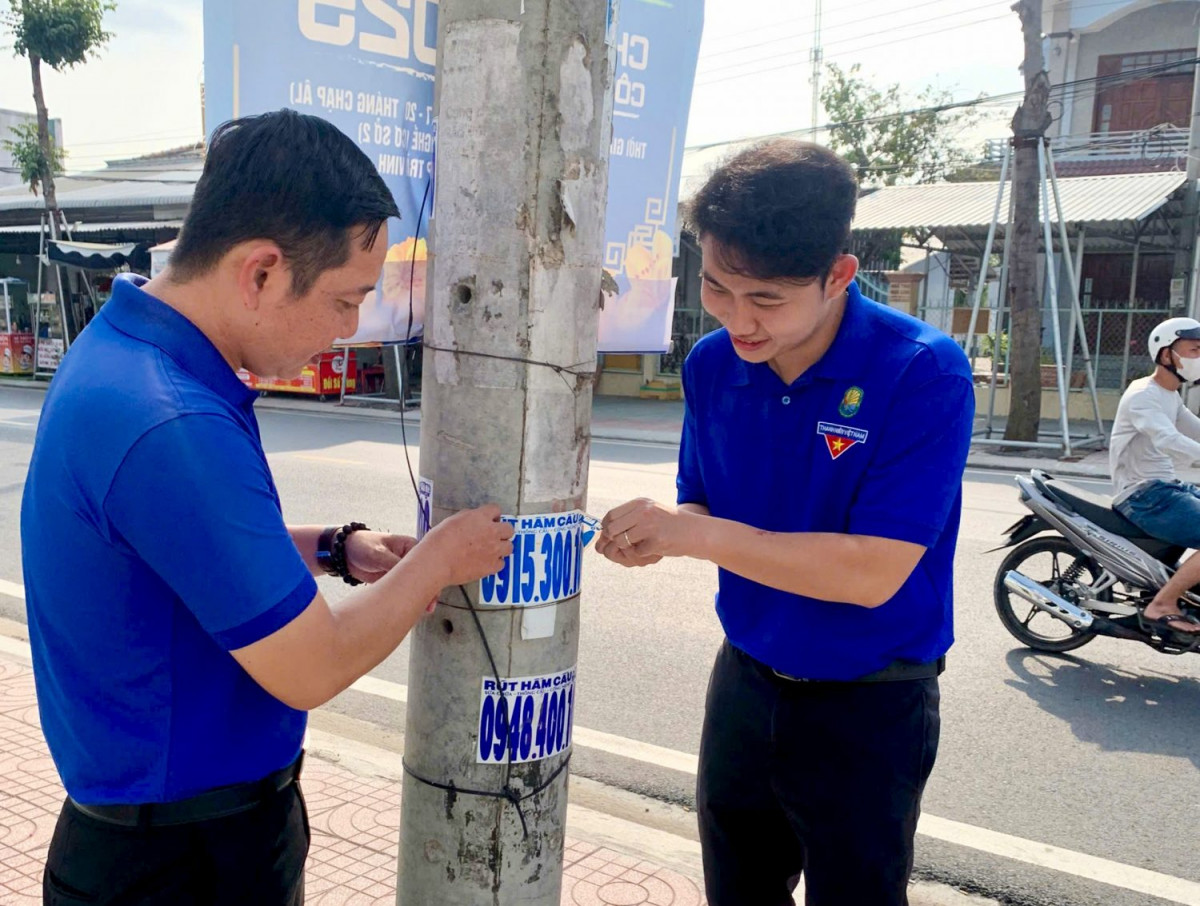 Tại đây, các bạn đoàn viên đã cùng nhau thu gom xử lý rác thải nhựa ở khu vực bồn hoa; tiến hành tháo gỡ quảng cáo rao vặt trên các cột điện,… trên tuyến đường Phạm Ngũ Lão thuộc ấp Long Bình.