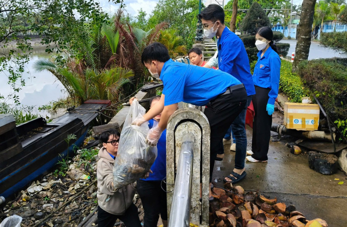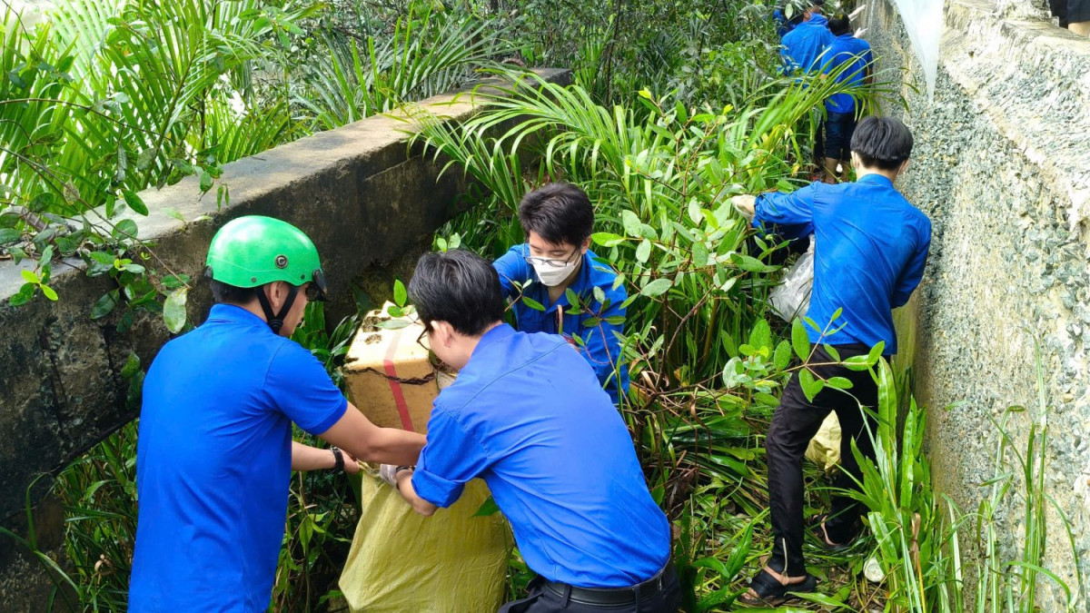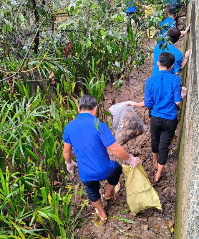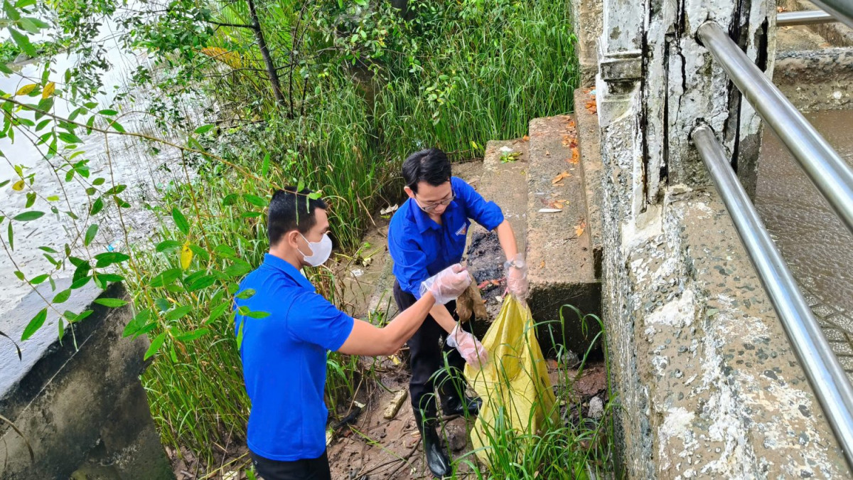Đoàn viên thu gom rác thải dưới bờ kè sông Long Bình